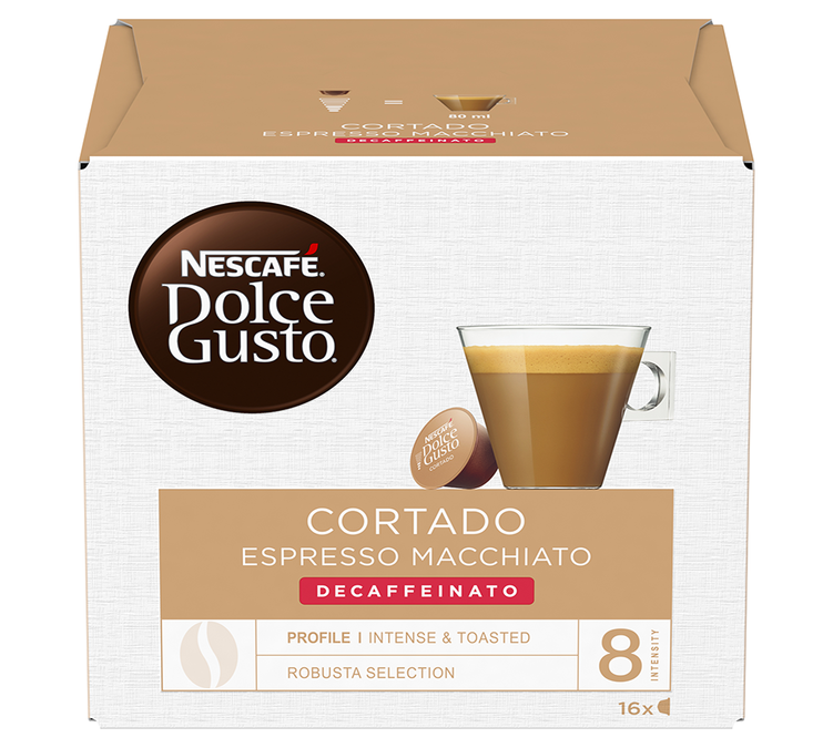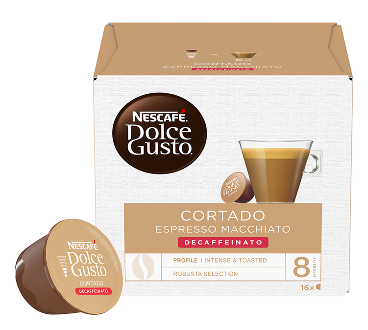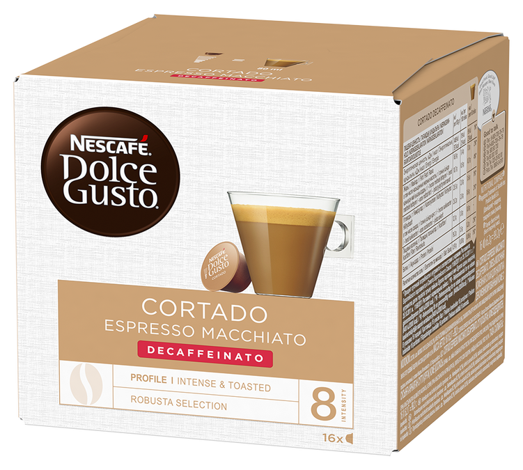 Discover these 16 Cortado Decaffeinato Nescafe* Dolce Gusto* espresso pods and let yourself be transported by this delicious drink that's as powerful as it is authentic. Its milky sweetness will bring you softness and comfort at any time of day.