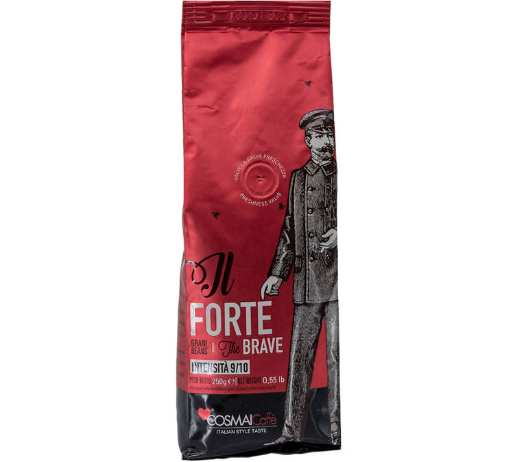 Cosmai Caffè 'The Brave' coffee beans: a blend of 40% Arabica & 60% Robusta from Brazil, India, Guatemala and Tanzania. For a strong espresso with intense notes of cocoa. Roasted in Italy. 250g coffee beans.