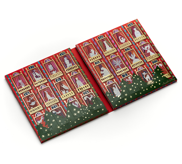 This calendar is an invitation to rediscover your inner child, with a snowy landscape design that reveals, as you open it, a series of playful little scenes and whimsical characters accompanying the tasting of the 24 flavours hidden within.