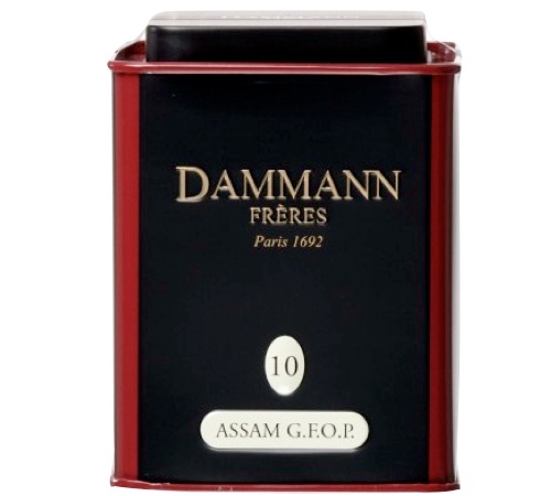Unique metal tin by Dammann Frères containing 100g of Assam GFOP black tea.