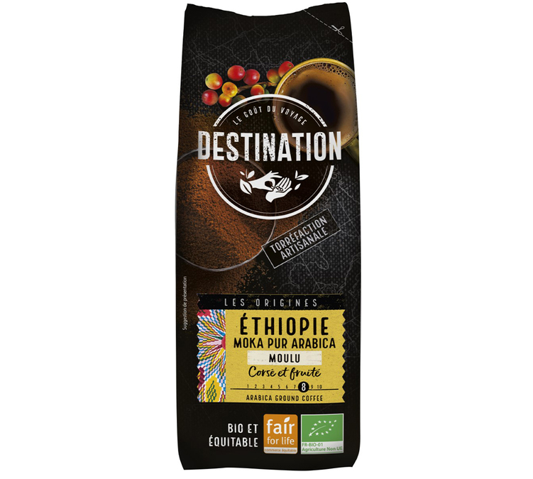 Destination Moka Pur Arabica organic ground coffee: 100% Arabica Moka coffee, grown in the Djimmah & Limu regions in Ethiopia. This coffee comes from a rich and distinctive soil. It develops fruity and floral notes with a slight acidity. Very enjoyable! The packaging for this Destination ground coffee (500g) can change according to the supplier.