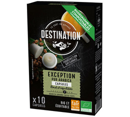 Destination Pure Arabica coffee capsules: 100% organic Arabica for a balanced espresso with toasty notes. Made from biodegradable & compostable wood fiber, guaranteed GMO-free and aluminium-free. 1 box of 10 Nespresso compatible capsules.