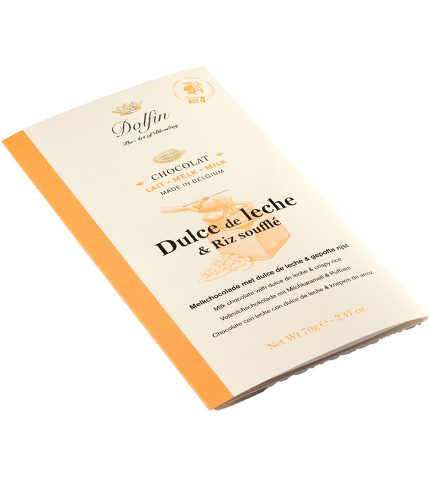 In his large collection of chocolate bars, Dolfin has thought of those who love dulce de leche. Dulce de leche, or milk jam, is a voluptuous mixture of milk and sugar cooked over a very mild heat. Combined with terribly crisp puffed rice, it is a perfect duo to enhance milk chocolate. Discover it now!