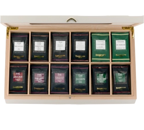 This elegant lacquered wooden box offers an assortment of 12 different teas (natural, flavoured and herbal teas). 12 different blends (6 individually-wrapped Cristal® sachets for each tea). A great gift idea from Dammann Frères.