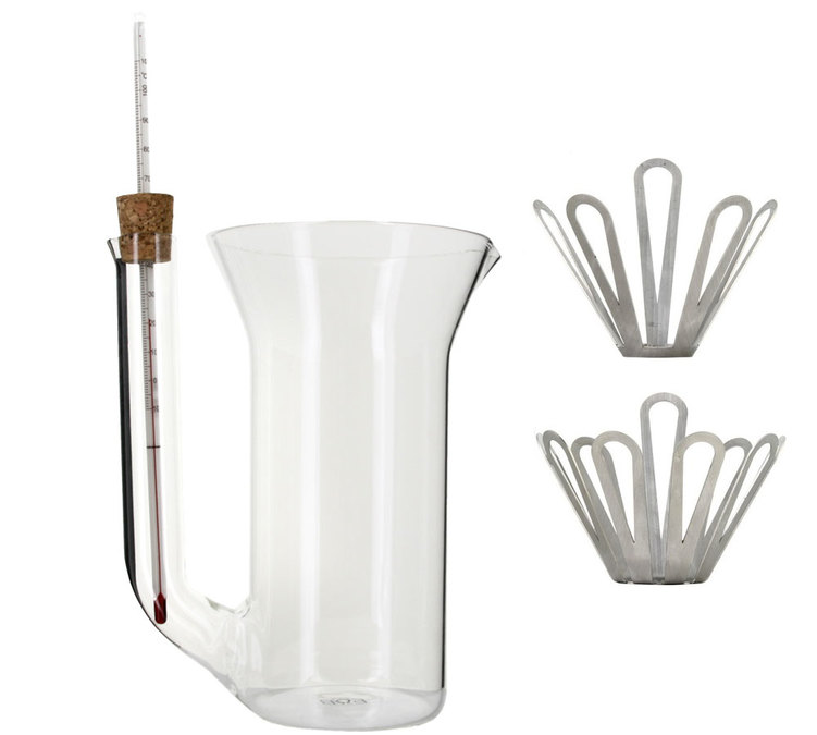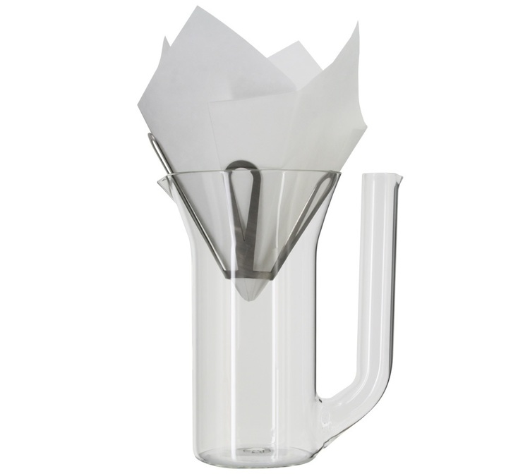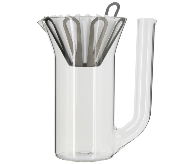 A 560 ml glass carafe by the E& B Lab creative laboratory with two openings to serve your coffee. Comes with a thermometer and two stainless steel filter holders for wave paper filters (Kalita-type) or cone-shaped filters (V60 or Chemex-type).