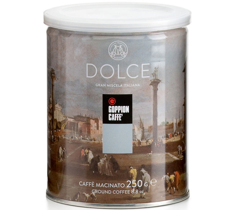 Goppion Caffè 'Dolce' is a blend of 90% Arabica & 10% Robusta. For a balanced coffee with a round body and a smooth crema. Roasted in Italy. 250g coffee beans in tin.