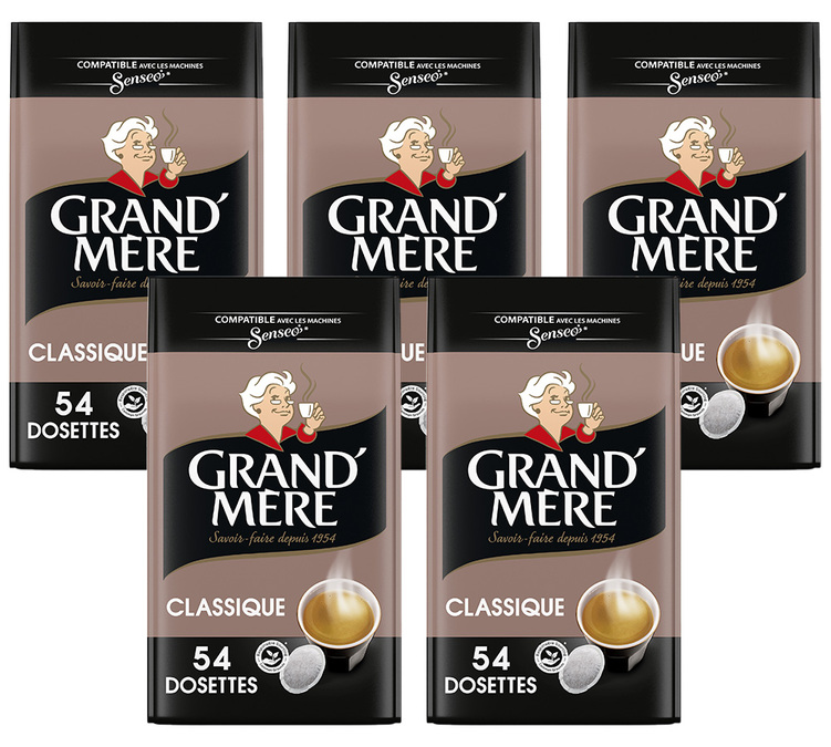 Discover the Senseo® compatible Classique soft pods from Grand Mère coffees. In a cup, this balanced coffee will give you lively aromas and a lovely roundness in the mouth. Packaging: 5 packets of 54 soft pods.