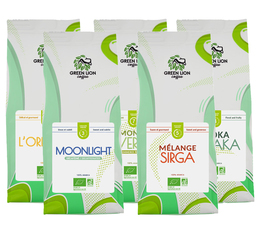 Discover our discovery pack Organic Coffee Beans Green Lion Coffee: a practical, tasty and 100% organic 1.250kg pack! Comprising 5 x 250g packets, it makes up to 170 cups, or around a month and a half's worth of coffee. Take advantage of free delivery for a hassle-free purchase and enjoy a rich break with these 5 100% organic arabica coffees, one of which is Fair Trade certified.