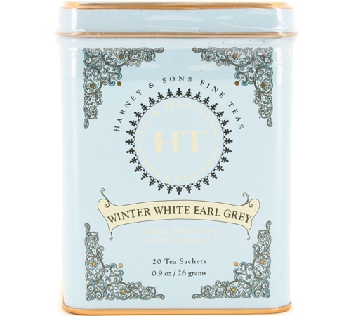 'Winter White Earl Grey' by Harney & Sons is a blend of high end Chinese Mutan white tea with bergamot oil. A lighter yet very satisfiying Earl Grey! 20 silken sachet in metal tin.