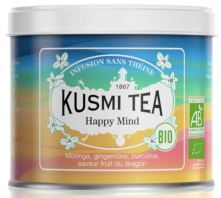 This colorful tin contains concentrated happiness: Happy Mind organic herbal tea by Kusmi Tea. Happy Mind lives up to its name: it’s a joyful organic blend of lemon, dragonfruit, ginger, turmeric and moringa, not to mention a hint of chili pepper! Give in to this feel-good organic herbal tea! 100g loose leaf tea.