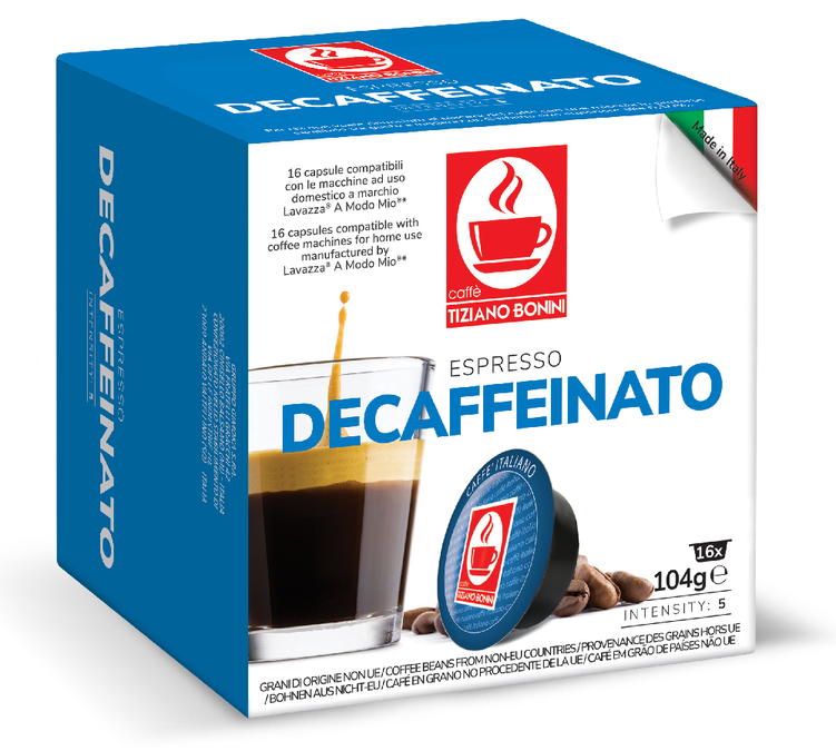 Caffè Bonini Decaffeinato: For a balanced espresso without the caffeine content. Roasted in Italy. 1 box of 16 capsules for Lavazza A Modo Mio.