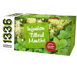 Box of 25 sachets of Linden and Mint infusion from 1336, a brand launched by SCOP TI in France. It combines the sweet honey-like taste of linden with the freshness of mint. No artificial flavourings.