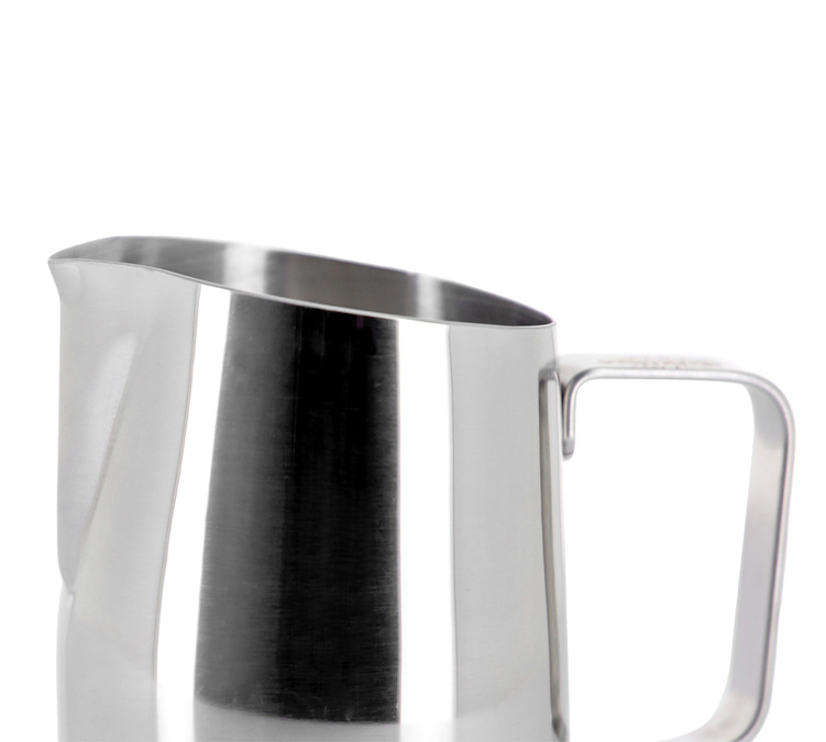The pitcher's closed handle makes it easy to hold and control the pouring of your milk foam.