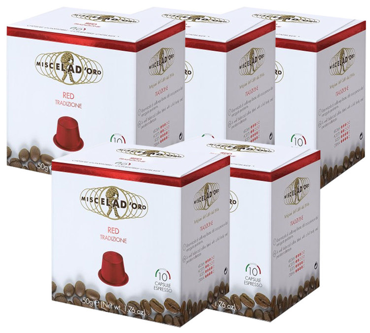 Capsules compatible with Nespresso* Original machines. Red Tradizione capsules by Miscela d'Oro. A strong coffee with notes of toasted bread created by an Italian roaster. For a coffee with a round body and lingering aftertaste. Capsules compatible with Nespresso* Original . 5 packs of 10 capsules.