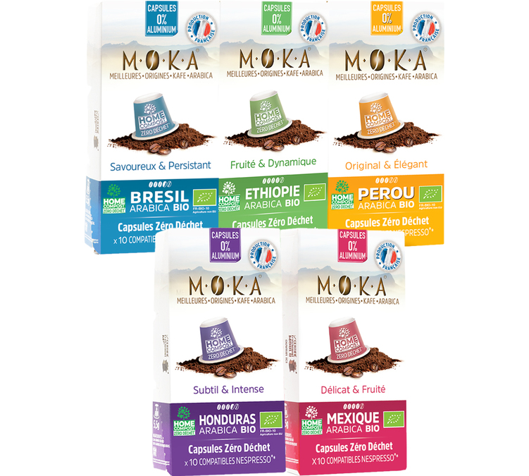 Discover the range of organic & biodegradable capsules from MOKA. 5 pure origin coffees with great aromatic notes. 100 % Arabica. The MOKA capsules are vegetal : they are made of corn starch with no aluminium at all. Biodegradable within 3 months. 5 boxes of 10 Nespresso* Original compatible capsules.