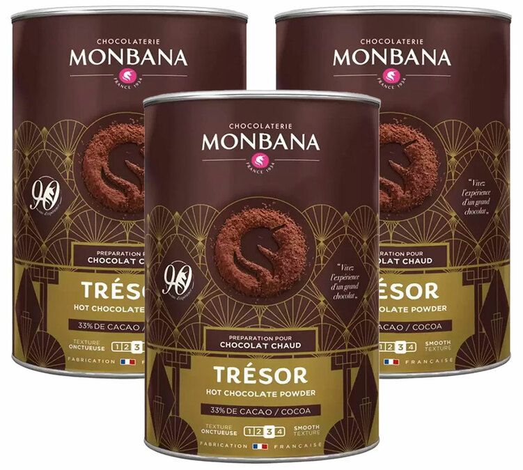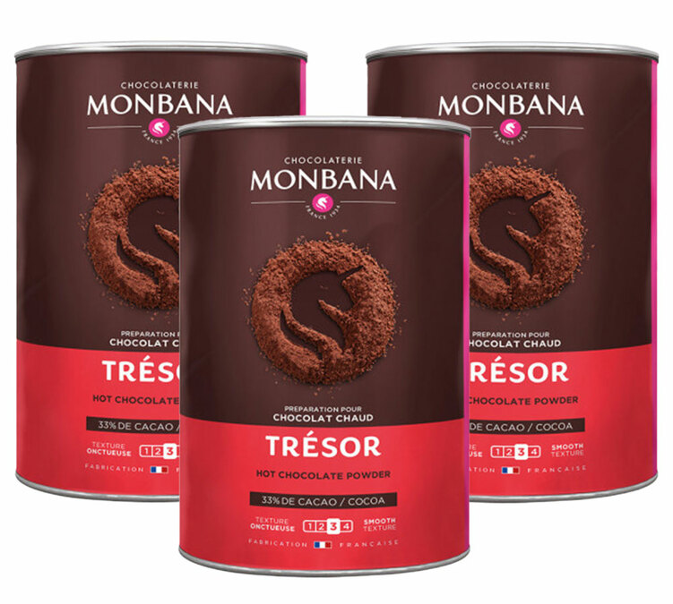 Trésor au chocolat is a chocolate powder from Monbana that makes a smooth, frothy hot chocolate! Enjoy this bundle of 3 box of 1kg hot chocolate powder.