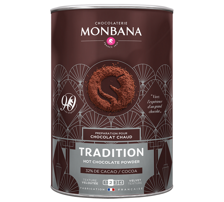 Monbana Tradition "Salon de Thé" contains at least 32% cocoa. For a velvety hot chocolate just like in a traditional tea room. 1kg box.