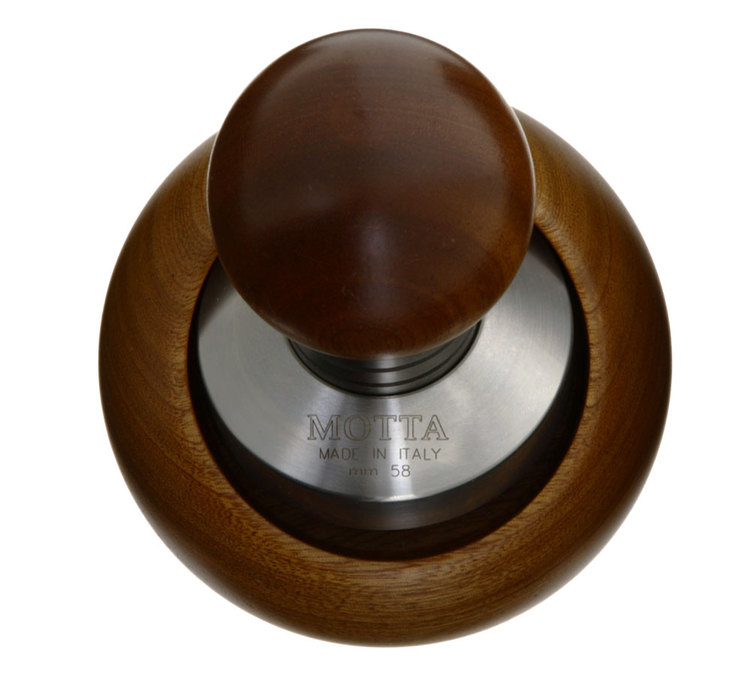 MOTTA 18/10 grade stainless steel tamper with detachable wooden handle. 58mm diameter flat base. This high quality tamper comes with its own bubble-shaped holder. Made in Italy.