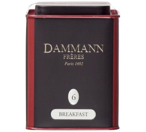 Unique metal tin by Dammann Frères containing 100g of Breakfast tea. A blend of quality Ceylon, Darjeeling and Assam natural black teas.