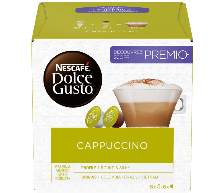 Nescafé* Dolce Gusto* Cappuccino pods: A strong espresso topped with a silky milk froth for the perfect cappuccino at home! 1 box contains 8 coffee pods & 8 sweetened milk pods. To make 8 drinks.