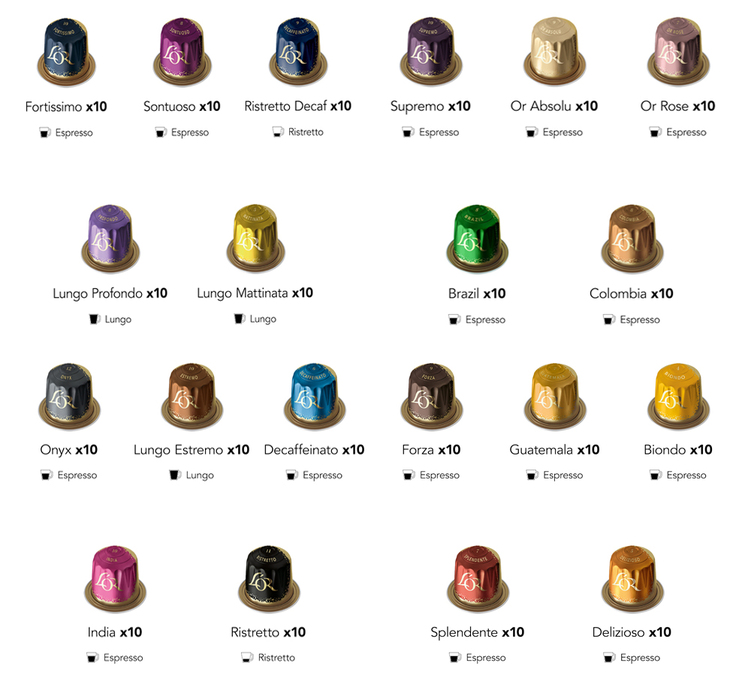 Forza, Guatemala, Biondo, Splendente, Delizioso, Onyx, Lungo Estremo, Decaffeinato, India, Ristretto, Supremo, Or Absolu, Or Rose, Brazil, Colombia, Fortissimo, Sontuoso, Ristretto Decaf, Lungo Profondo and Lungo Mattinata.
