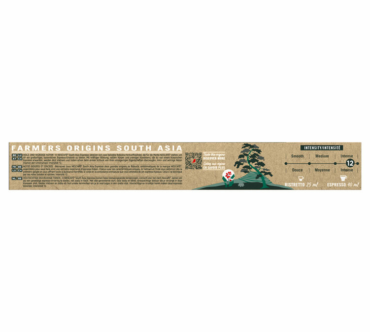 Go on a journey to discover the unique flavours of South and Southeast Asia with these 10 Nespresso* Original -compatible Nescafé Farmers Origins South Asia capsules! Using your Nespresso* Original machine, you can make a full-bodied espresso (40 ml) with an intense body and woody, spicy notes. These rich aromas are accentuated by the presence of Robusta, which adds an extra dimension to this caffeinated experience. Packaged in boxes of 10 capsules, these capsules are ideal for coffee lovers looking for new exotic flavours. Capsules compatible with Nespresso* Original machines