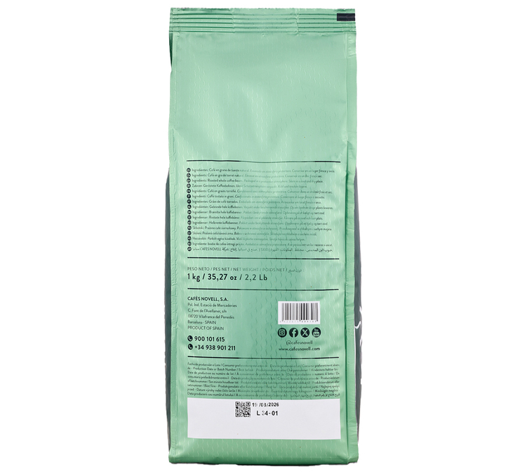 Try out this Barista Espresso 100% Natural coffee beans from Spanish coffee specialist Novell. This blend of Arabica and Robusta provides a liquor-like and distinguished coffee (with a hint of bitterness) with aromas of cedar and caramel. Ideally suited for lovers of intense Italian-style coffee. 1kg.