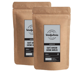 Crème Brûlée flavoured coffee by Les Petits Torréfacteurs.100% Arabica from Guatemala with a lovely aroma of Crème Brûlée. Roasted in France by a team of passionate artisan roasters. Artificial flavouring. Not sweetened. 2 x 125g ground coffee in kraft bags.