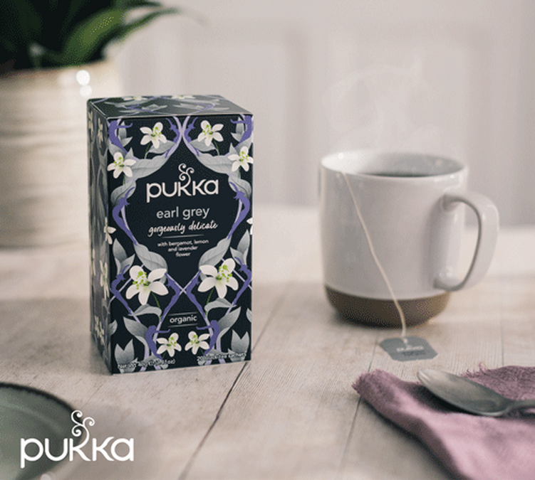 Pukka Gorgeous Earl Grey: A lovely blend of organic black tea from India, bergamot and lavender. For a lively cup of tea with soothing properties. 1 box of 20 tea sachets in recyclable envelopes.