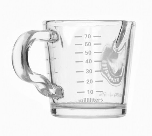 This Rhino Coffee Gear graduated glass is made to measure up your single or double espresso (10 ml to 70 ml). Doses written in ounces and milliliters. With 2 pouring spouts and handle. Made of strong glass.