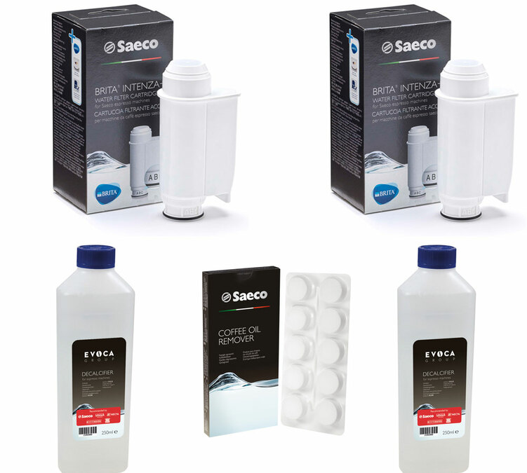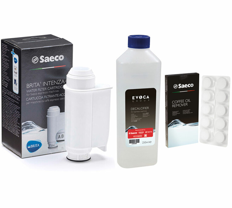 This kit from Saeco contains everything you need to look after your Saeco bean-to-cup machine. 2 x INTENZA+ water filters, 2 bottles of descaler and 1 pack of 6 coffee oil remover tablets.