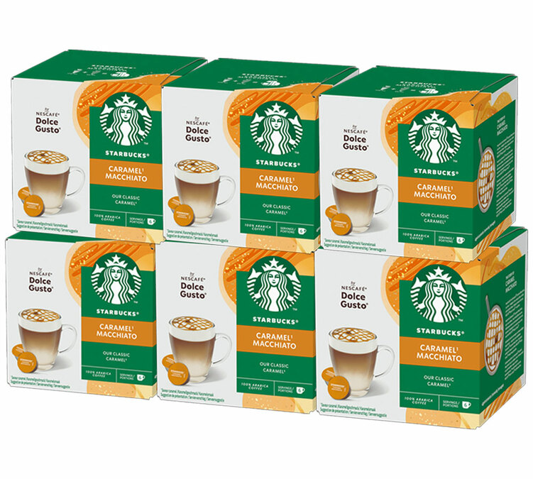 Enjoy a delicious Starbucks Caramel Macchiato at home! One box contains 6 coffee pods and 6 flavoured milk pods to create a really tasty drink! 6 boxes of Starbucks Nescafé* Dolce Gusto* pods to make 36 Caramel Macchiato.