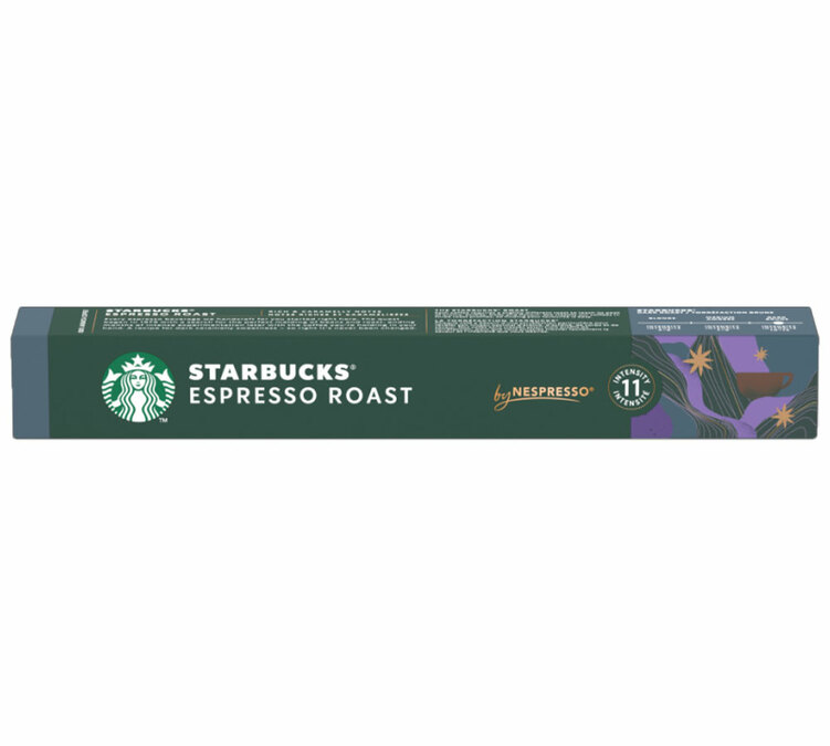 Starbucks by Nespresso Espresso Roast capsules: a dark American roast for a very strong espresso with notes of caramel. 1 box of 10 Nespresso* Original coffee pods.