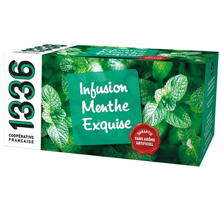 Box of 25 sachets of Sweet Mint infusion from 1336, a brand launched by SCOP TI in France. This infusion is 100% natural. It is perfect after a meal!