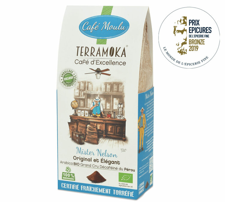 Mister Nelso' ground coffee by TerraMoka: an organic decaffeinated coffee from Peru. 100% Arabica. For a fine balanced coffee with fruity notes. Decaffeinated with water. 1 pack of 250g ground coffee.