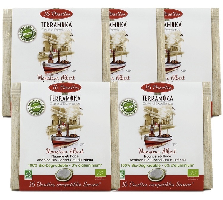 TerraMoka 'Monsieur Albert' coffee pods for Senseo: Organic grand cru Arabica from Peru. For a balanced coffee with fruity notes and a really pleasant after taste. Biodegradable coffee pods. Compostable packaging. 5 packs of 16 Senseo-compatible pods.