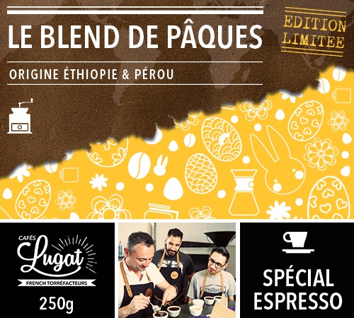 This Easter blend ground coffee is a blend of organic Arabica coffees from Ethiopia and Peru specially blended and roasted by the Cafés Lugat roasting team. This medium roast coffee offers you a quality espresso with notes of milk chocolate, caramel and hazelnut spread. A gourmet coffee! Packaging: 250g.