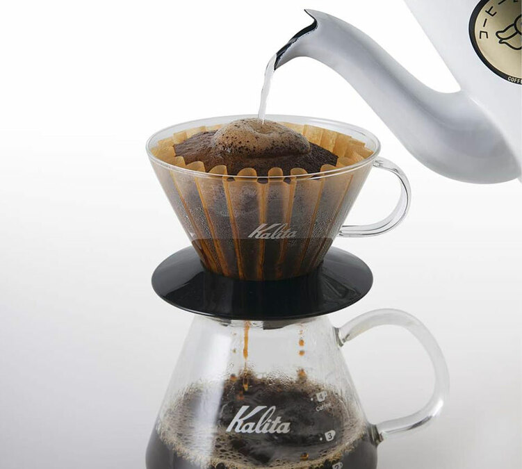 This glass Kalita Wave is a symbolic flat-bottomed dripper. With its three-hole design and wave filters, it makes a flavoursome and full-bodied cup of coffee.