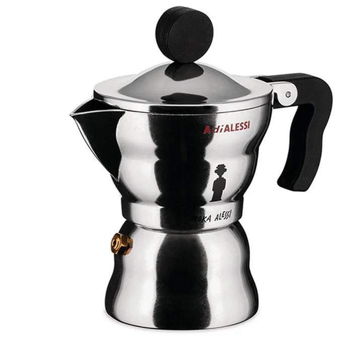 This Moka pot by Alessi is a revisit of the classic Italian coffee maker. While the original octagonal version was inspired by futurism and art deco, the Italian coffee maker designed by Alessandro Mendini is characterised by its roundness and curved lines. The thickness of the material has been optimised, the volumes of the containers have been calculated to offer maximum ease of use, and the ergonomics of the knob have been designed to ensure a good grip. Its small size and aesthetic appeal bring the artistic philosophy and talent of its creator, Alessandro Mendini, to the fore.