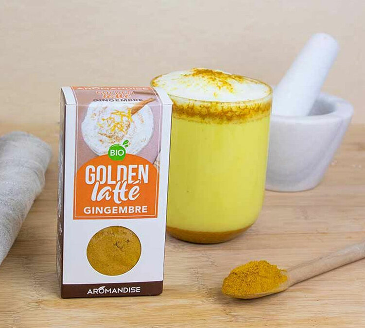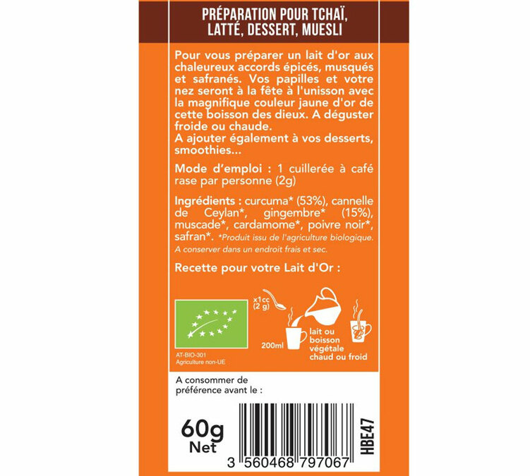 Ingredients: turmeric* 53%, Ceylon cinnamon*, ginger* 15%, nutmeg*, cardamom*, black pepper*, saffron*. *Certified organic.