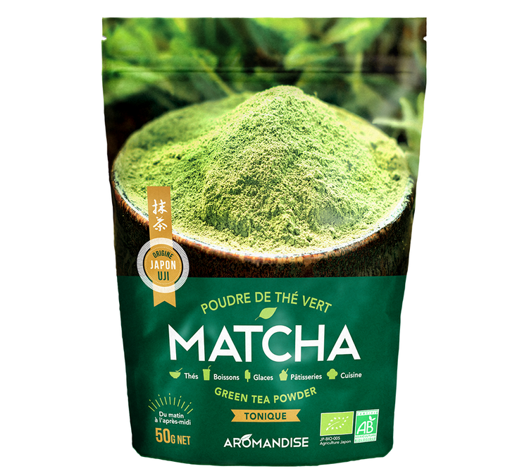 Choose Aromandise's Matcha green tea made from steamed, dried and powdered premium Gyokuro tea leaves using a stone grinder. It is full of flavour and health benefits. Packaging: 50g.