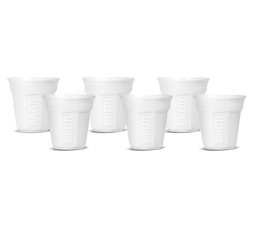 A set of 6 white porcelain espresso cups from the "Bicchierini" range by Bialetti. Capacity: 90ml each. Dishwasher-safe.