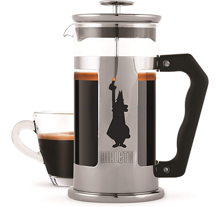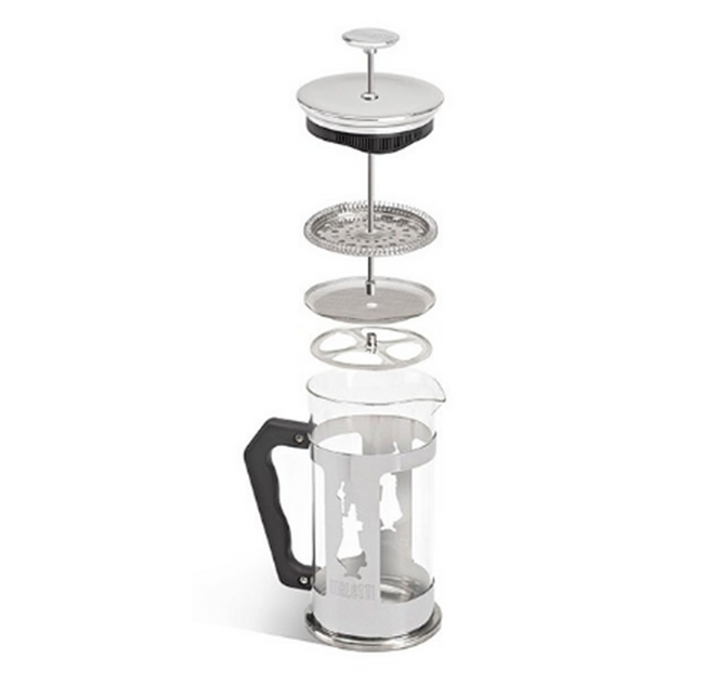 Bialetti French Press Preziosa with 3 cups capacity (350ml), for lovers of a more traditional coffee. 18/10 stainless steel frame with Bialetti mascot shape and borosilicate glass jug. A stylish design that will fit perfectly into any kitchen. Dishwasher-safe.