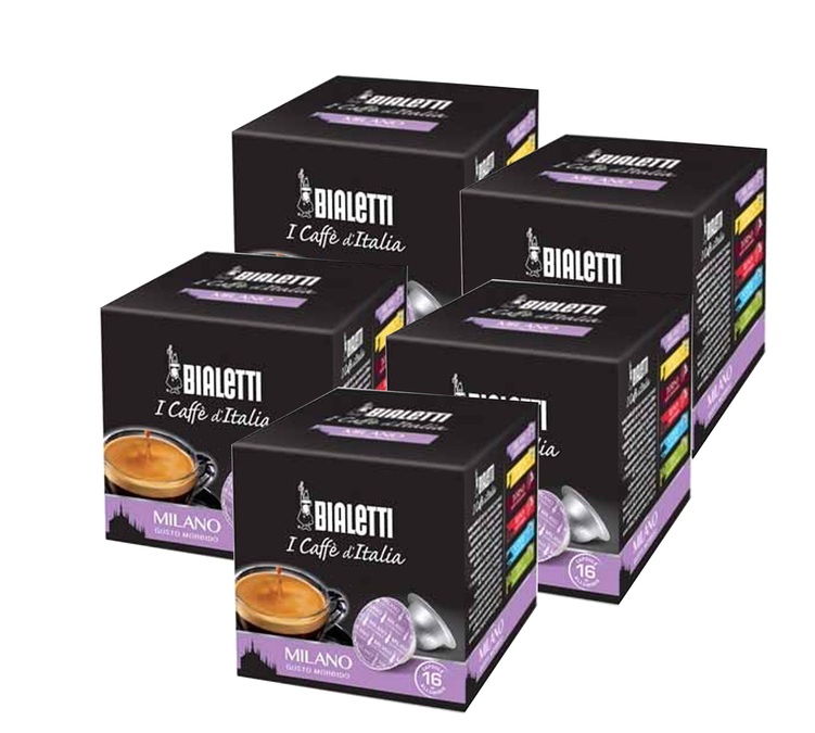 80 Mokespresso aluminium coffee capsules by Bialetti (100% Arabica) for new machines by the same brand. 5 boxes of 16 capsules.
