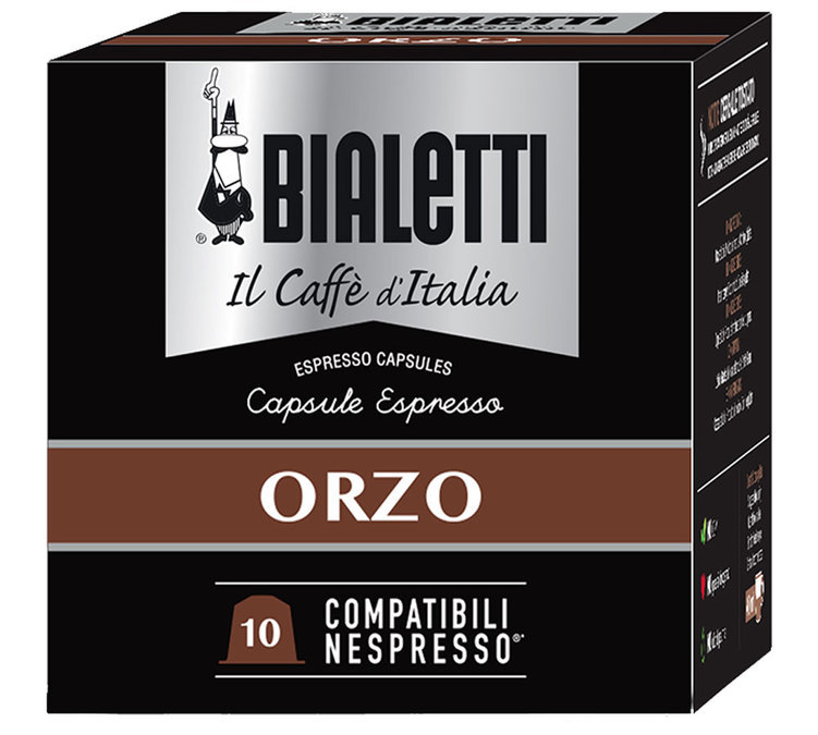 Bialetti Orzo (Barley) capsules: a caffeine-free drink with roasted barley from Italy. Orzo is a healthy coffee alternative, good for digestion. 10 Nespresso-compatible capsules.