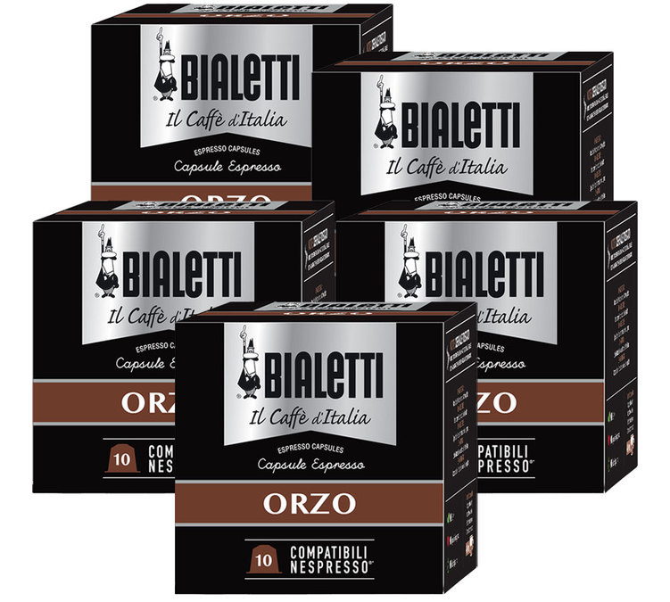 Bialetti Orzo (Barley) capsules: a caffeine-free drink with roasted barley from Italy. Orzo is a healthy coffee alternative, good for digestion. 5 boxes of 10 Nespresso-compatible capsules.