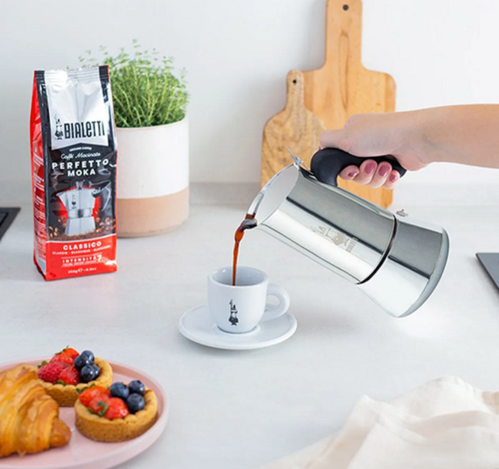 Capacity: 2 cups (85ml). With Bialetti self-cleaning security valve. A stylish stovetop coffee maker from Italy.