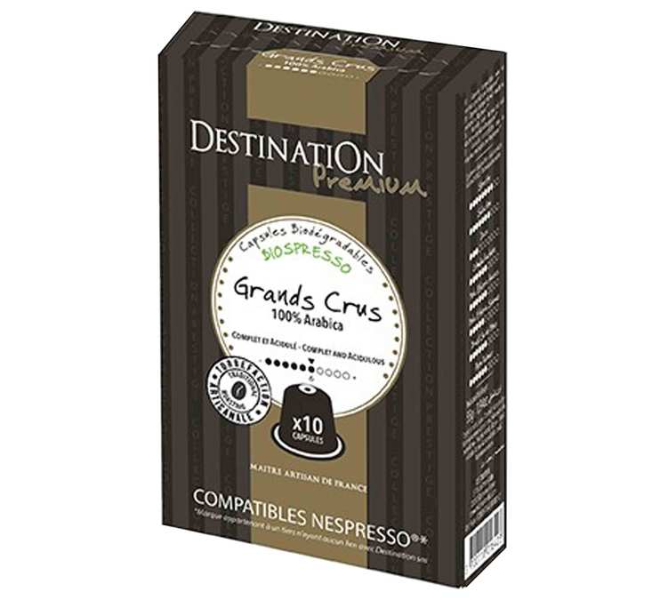 Destination Grands Crus is a pure Arabica organic coffee selected from the best coffee plantations. This blend will offer you an intense espresso with generous aromatic notes. Made from biodegradable & compostable wood fiber, guaranteed GMO-free and aluminium-free. 1 box of 10. Capsules compatible with Nespresso* Original machines