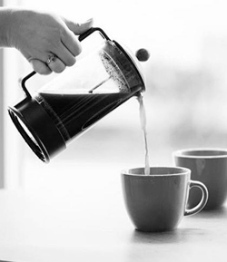 The French press coffee maker is the simplest of all brewing systems, where coarsely ground beans meet hot water right off the boil. The right temperature (92–96 °C, 195–205 °F) brings the optimal extraction power for the essential oils in the beans to develop their full flavor profile in just four minutes. An easy press on the plunger locks the grinds at the bottom of the glass carafe and stops the brewing process.