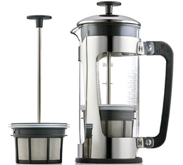 The Cafetiere is the simplest of all brewing systems, where coarsely ground beans meet hot water right off the boil. The right temperature (92–96 °C, 195–205 °F) brings the optimal extraction power for the essential oils in the beans to develop their full flavor profile in just four minutes. An easy press on the plunger locks the grinds at the bottom of the glass carafe and stops the brewing process.